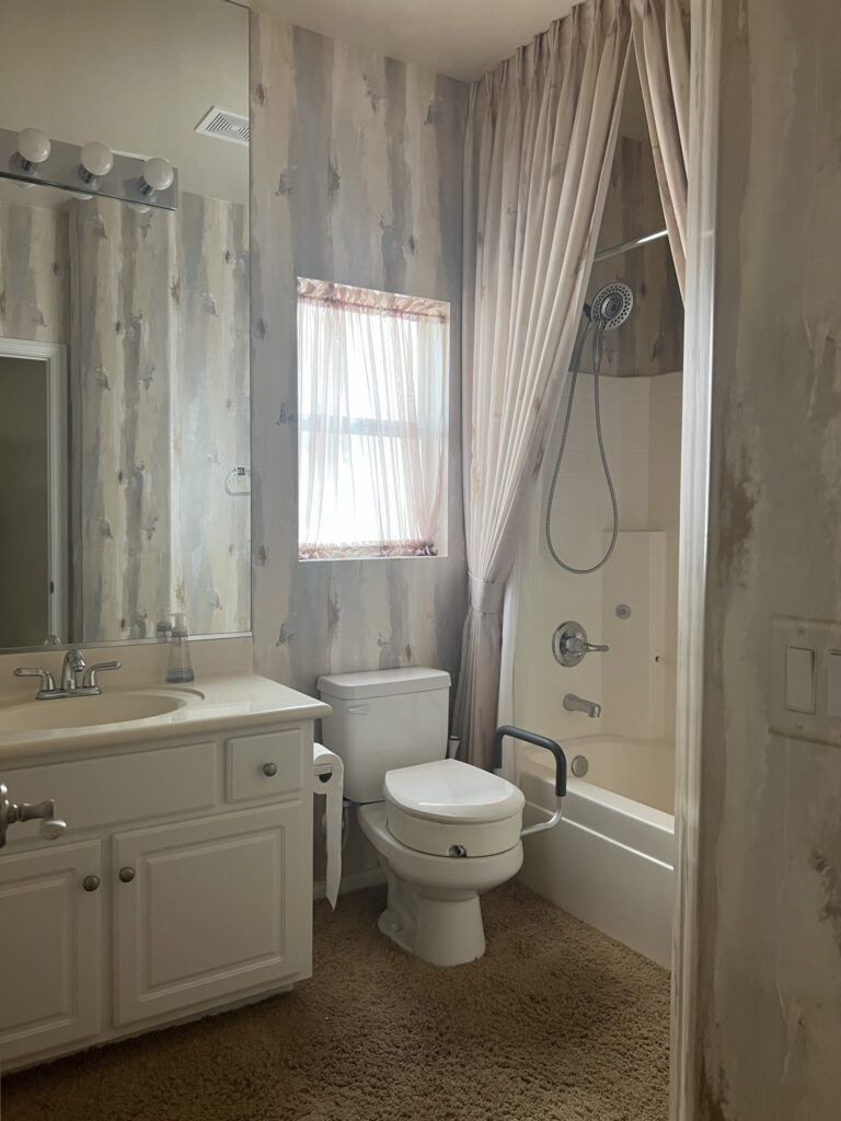 We replaced the toilet and the carpet (who ever thought that was a good idea in a bathroom?) with some cute peel and stick tile almost right away. We also removed the wallpaper within the first few months.