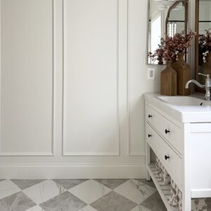 The checkered floor tile and the picture frame molding are probably my favorite design elements in here. I think the mirror adds some nice warmth to the space!