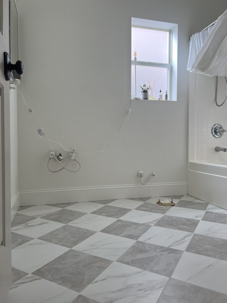 After that, it looked pretty bad still but better than before. For a while, we didn’t make any more changes to the hallway bathroom. We had so many other projects around our home that took priority. It also took me some time to decide what I wanted this hallway bathroom to look like – until last winter! That’s when we painted the walls using my favorite white paint color for walls: Sherwin Williams Alabaster. We also finally tiled the floor using gray and white checkered tiles.