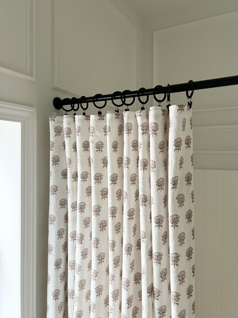 Fun fact: I had a very specific vision for the shower curtain and couldn’t find anything that resembled what I envisioned. However, I did find a beautiful quilt by Studio McGee at Target. It had the exact colors and pattern I was looking for. I decided to just make my shower curtain out of that! It was actually easier than it sounds. I just separated the fabric, cut it to size and finished the edges off with some iron-on hemming tape.