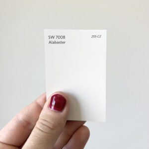 We used Alabaster on the walls and ceiling and Accessible Beige on the baseboards and door!
