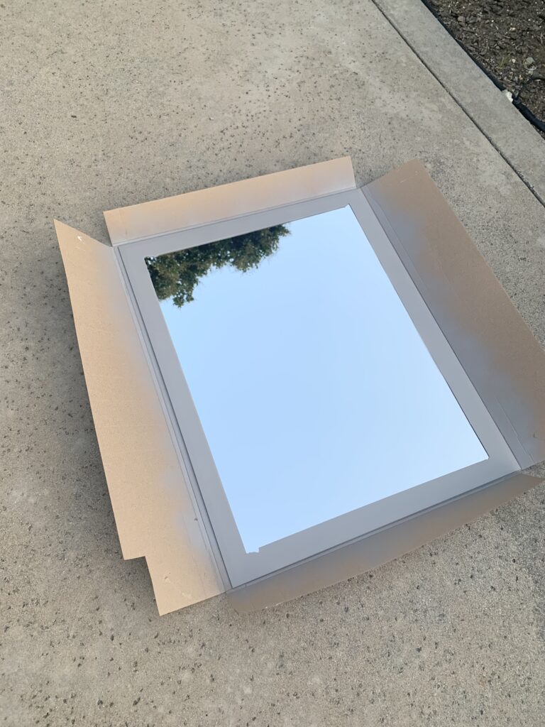 I also decided to spray paint the frame of the mirror so that the mirror wouldn’t show in any of the tiny gaps between the wood. Before spray painting, I taped the mirror off with painter’s tape and a trash bag.