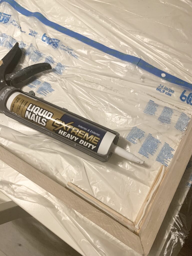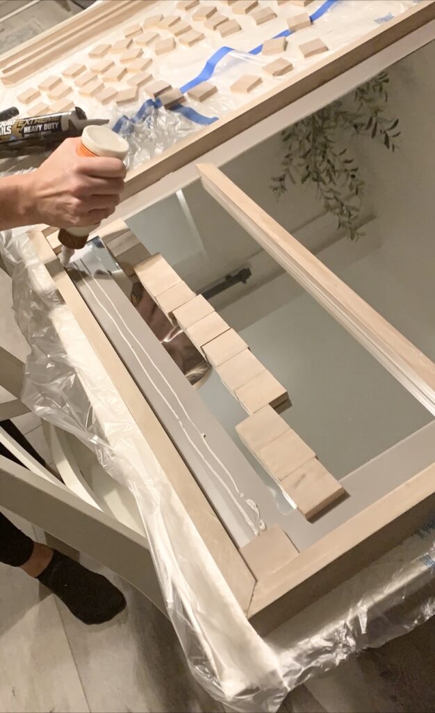 After that, it was time to assemble the mirror. I used liquid nails on the surfaces where the mirror would meet the wood…