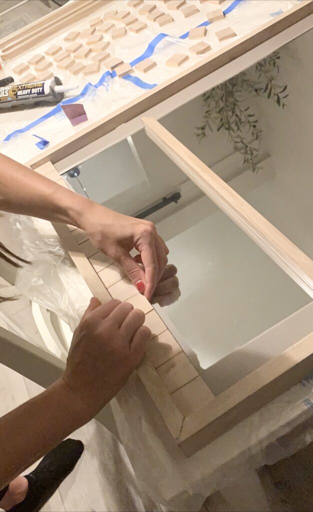 I cut the 1/2x2s into squares and placed them around the parameter of the mirror before adding the 1×1 frame in the center. I found it helpful to hold those center pieces up to where they should go and then mark where to cut them vs. measuring them. Doing it this way helped me get more accurate cuts to ensure a tight fit!