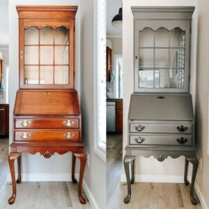 A few weeks later, I painted all of our kitchen cabinets and made sure to spend some extra time sanding these two cabinet doors. I’m so happy with how this little Frankenstein cabinet turned out!