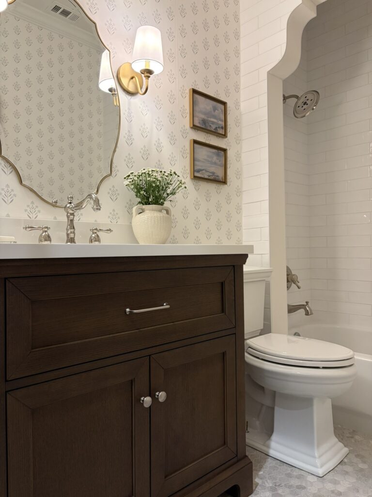 The main design element is the shower with a unique arch to create somewhat of a separate space. The floral wallpaper is also a design element I’ve never added to any of my previous spaces so I was excited to incorporate that!