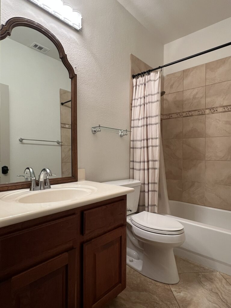 Our house was built in the early 2000s. However, the guest bathroom was not entirely builder grade/original to the house. Parts of it were remodeled at some point like the shower and the floors.