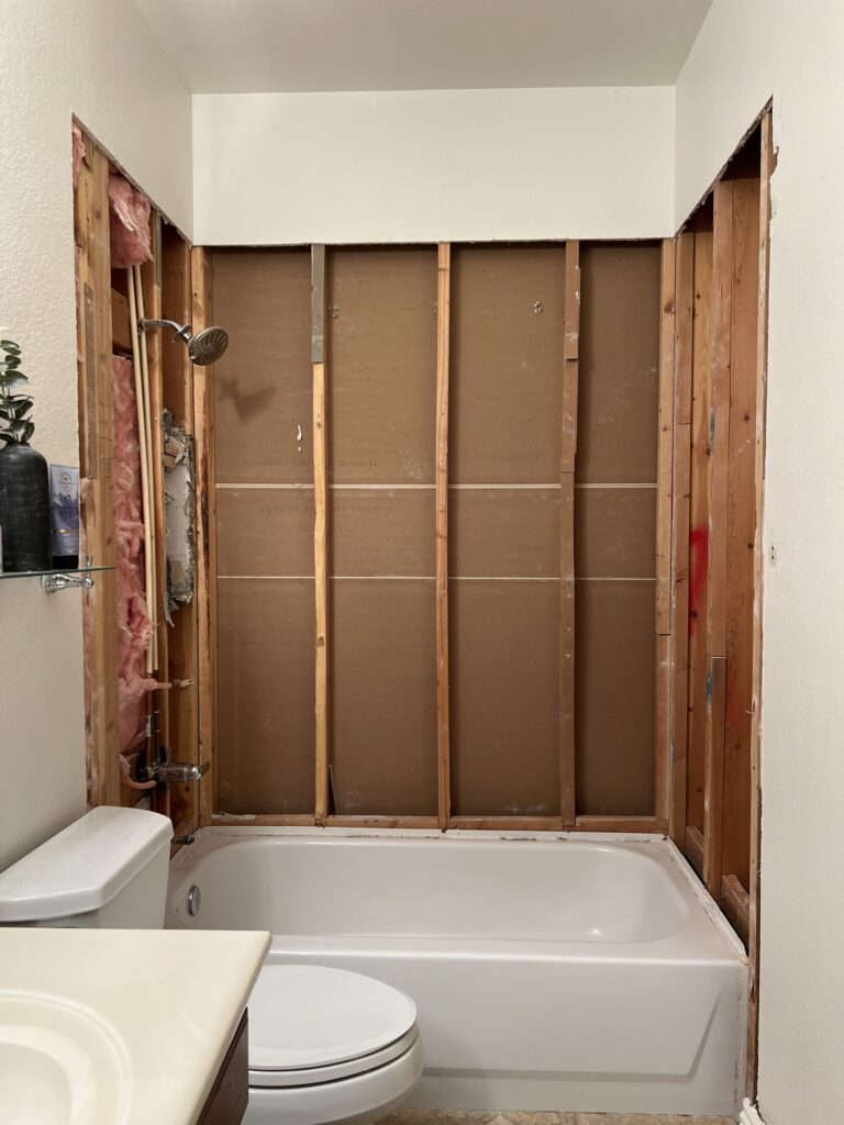 To keep our only downstairs bathroom functional for as long as possible, I decided to focus on the shower first and removed the shower tile while keeping the vanity and toilet in place: