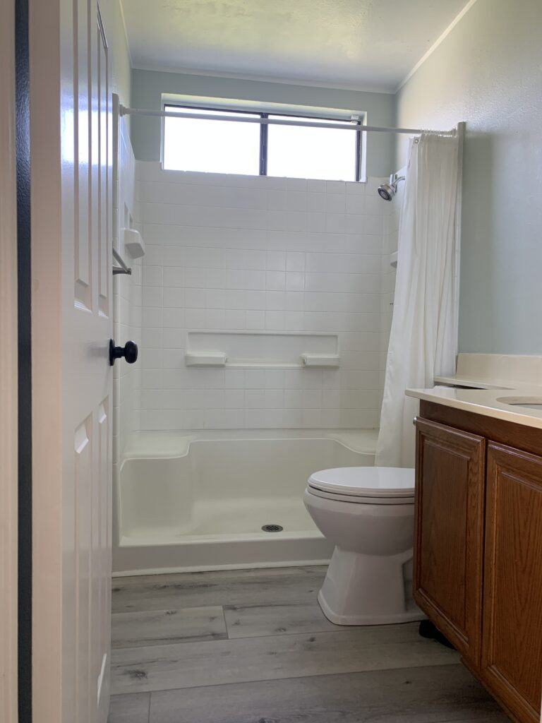 I used Sherwin Williams Sea Salt at the California Cottage in the primary bathroom when we first moved in before our primary bathroom remodel and it definitely made this relatively small bathroom appear bigger: